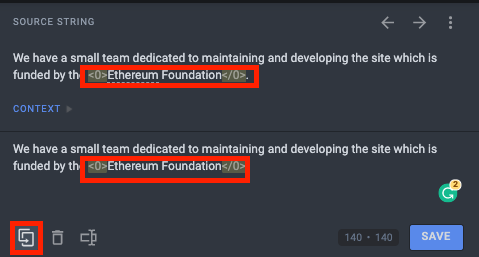 • To keep the string safe, we recommend that you click the "Copy Source" button on the bottom left. This will copy the original string and paste it into the text box. This lets you clarify where the tags are and helps you avoid mistakes.